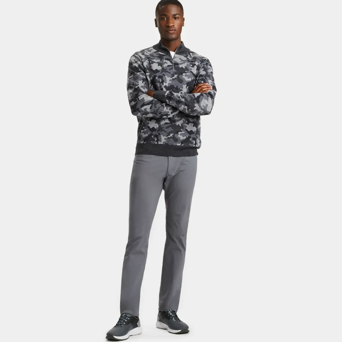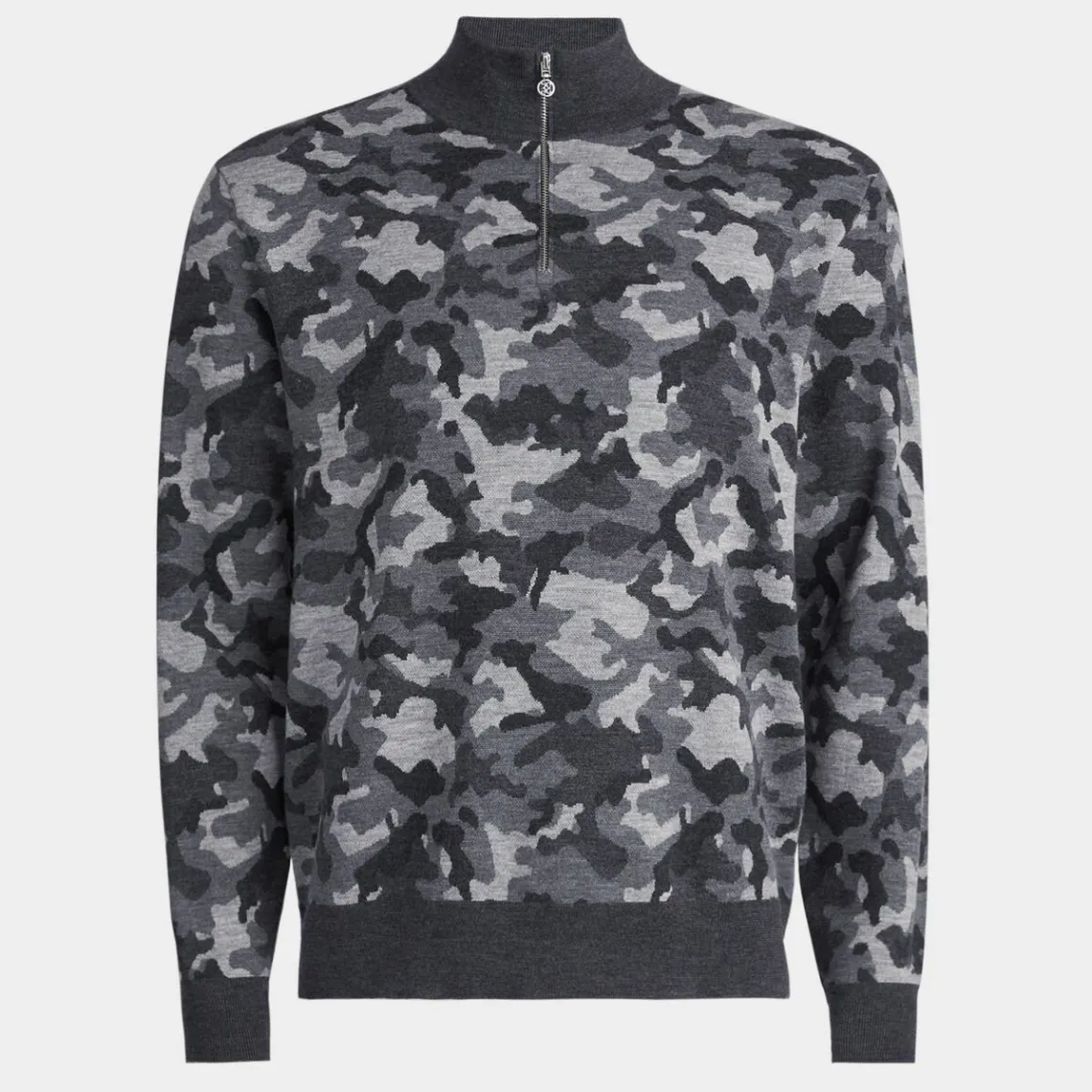 Made From Breathable Camo Jacquard Merino Wool, This Quarter Zip Sweater Is An Easy Layering Piece You Can Throw On Over A Polo Or Tee. Equipped With Moisture Wicking And Odor Inhibiting Properties, It Provides Just The Right Amount Of Warmth On Or Off The Course.