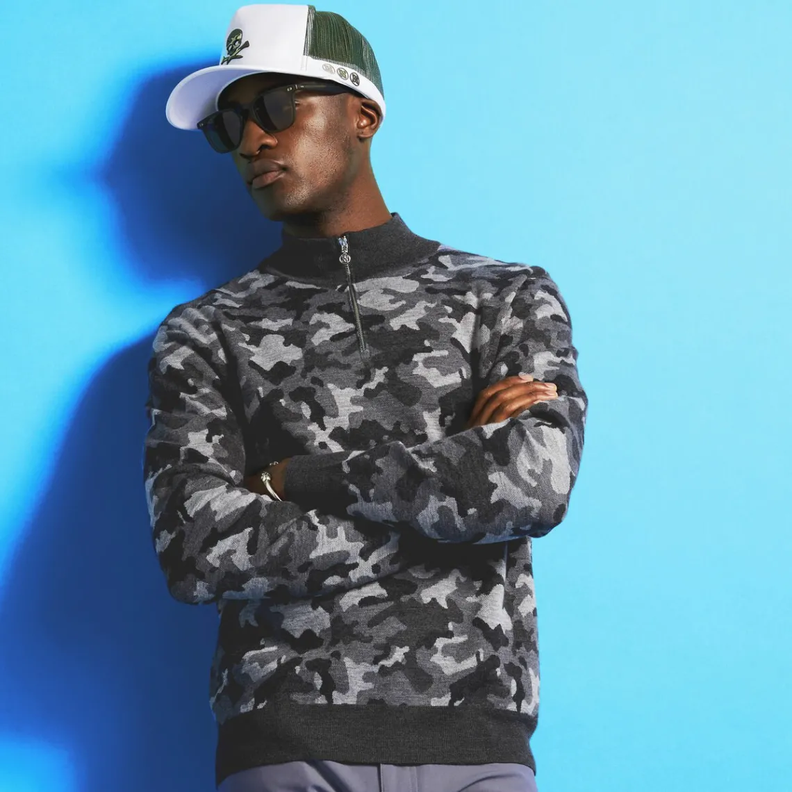 Made From Breathable Camo Jacquard Merino Wool, This Quarter Zip Sweater Is An Easy Layering Piece You Can Throw On Over…